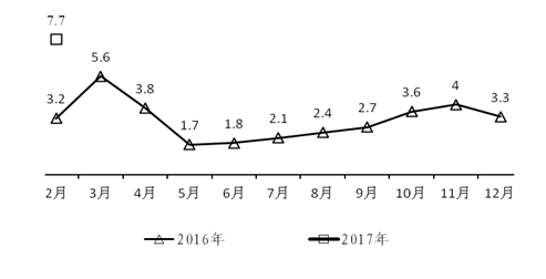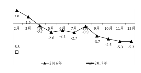 (五)工业生产者出厂价格指数持续回升。工业生产者出厂价格指数延续去年10月份以来持续回升态势,连续5个月同比上涨。今年1月份,全省工业生产者出厂价格同比上涨5.0%,2月份同比上涨5.5%,1-2月平均增长5.3%。