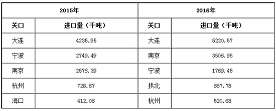 2016年中国95%的PX从大连、南京、宁波、拱北、杭州五大关口进口。因为以上五个地区是PTA的主要集散地,距离下游PTA产地存在距离优势,进而节省相当大部分的运输费用。其中首位大连关口持续蝉联,主要是因为下游PTA生产企业在大连具备总计1260万吨/年的生产能力,且大连作为被北方的重要进出口枢纽而被广泛使用所致。